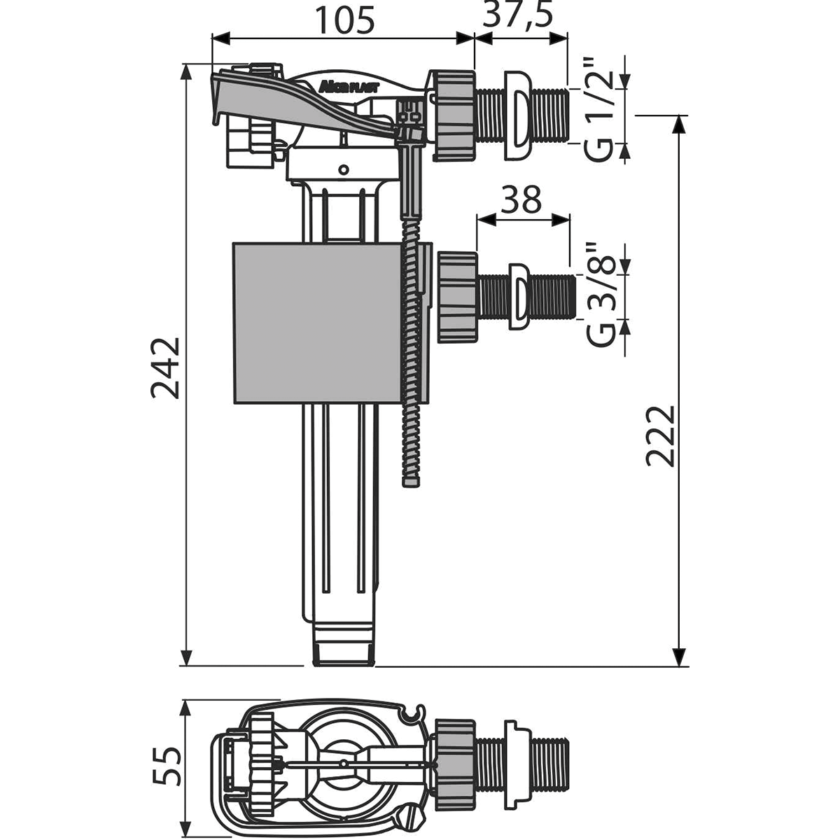 Napouštěcí ventil boční, univerzální 1/2"a 3/8", plast. závit